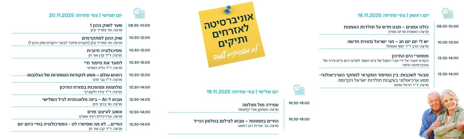 אוניברסיטת חיפה ועיריית חיפה גאים לפתוח את התוכנית "אוניברסיטה לאזרחים ותיקים": יוזמה חדשנית המעניקה לתושבי ותושבות חיפה בני 60 ומעלה הזדמנות ללמוד ולהתפתח במגוון קורסים בנושאים שונים, תוך מתן דגש על לימודים מעשיים ומתן כלים חדשים.